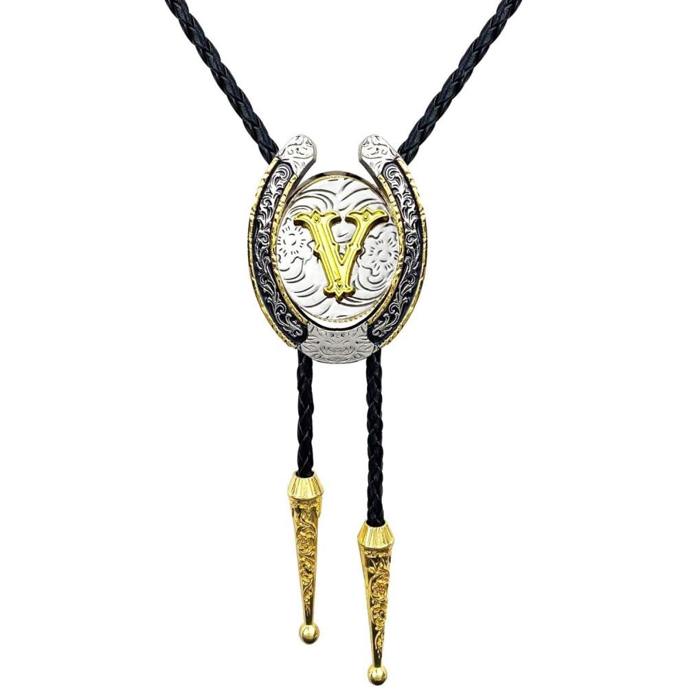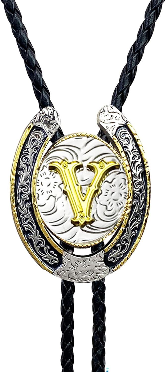 TOPACC Native American Bolo Tie for Men Women Gold Western Bolo Tie Initial Letter A To Z Vintage Cowboy Necklace(V)